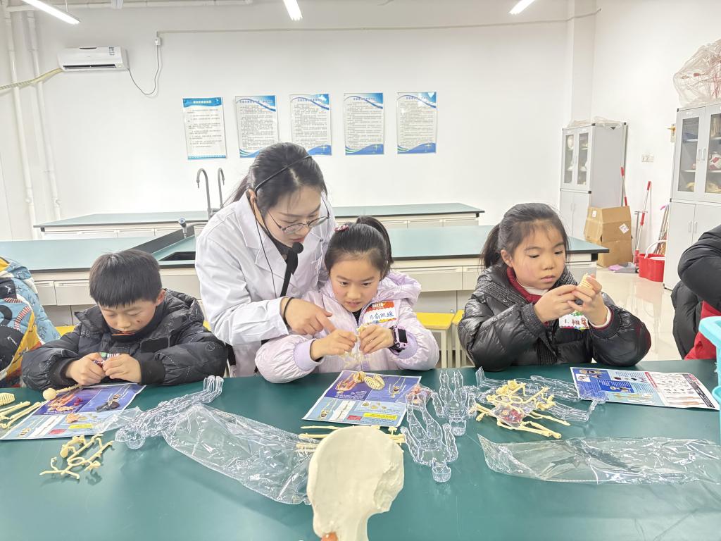 讲解结束后,骨骼小模型组装大赛悄然拉开帷幕。孩子们小心翼翼地拿起一块块骨骼模型,如同小小的建筑师般,精心搭建着属于自己的骨骼世界。每一次拼接都承载着他们对生命构造的深刻理解,每一次成功都让他们的脸上绽放出无比自豪的笑容。