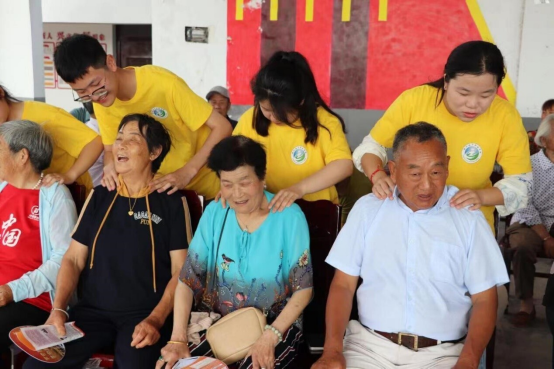(图为志愿者给老年大学的老人们推拿按摩)