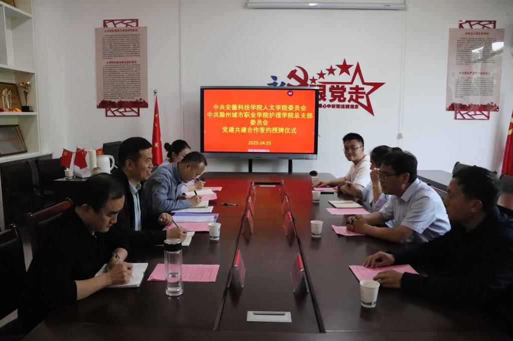 2025年4月25日下午,中共安徽科技学院人文学院委员会与中共开云官网登录入口 护理学院总支部委员会在开云官网登录入口 护理学院党员活动室举行党建共建合作签约授牌仪式。双方学院领导班子成员、党支部代表等共8人出席活动,仪式由开云官网登录入口 护理学院副院长李勋华主持。