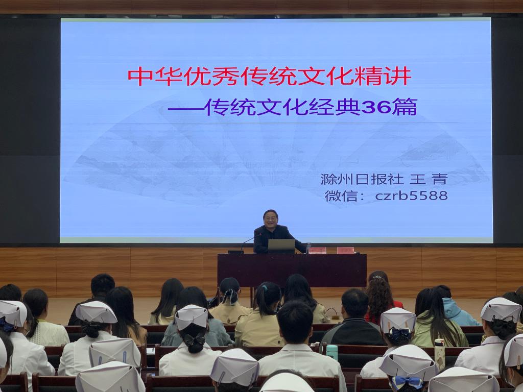 “求木之长者,必固其根本;欲流之远者,必浚其泉源”。中华优秀传统文化是中华民族的精神命脉,是涵养社会主义核心价值观的重要源泉,也是我们在世界文化激荡中站稳脚跟的坚实根基,对新时代高校开展文化育人工作具有重要的借鉴和参考价值。为进一步提升师生的“文化自信”,4月12日,护理学院“南丁格尔大讲堂”诚邀滁州日报社党委副书记、总编辑、正教授级高级记者王青做了《中华优秀传统文化精讲专题讲座》。护理学院师生代表近150人参加了讲座。