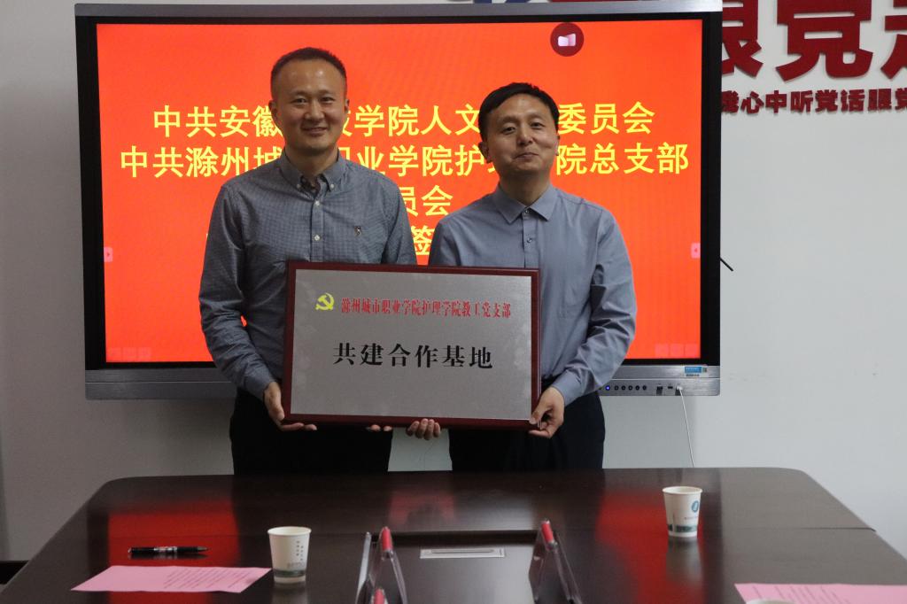 在与会人员的共同见证下,双方举行了庄重的签约授牌仪式:李晓东与席民代表两院党委签订《共建合作协议》;中文系教工党支部书记和建伟与护理学院教工党支部书记李勋华签订支部共建协议;安徽科技学院人文学院党委副书记李沙娜与护理学院党总支副书记卢齐伟互授“党建共建单位”牌匾;双方教工党支部书记互授“支部共建单位”牌匾。